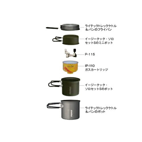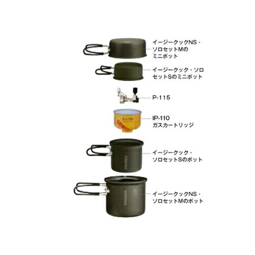 IP-110ガスカートリッジとP-115等のマイクロバーナーを一緒に収納することが可能なミニクッカーです。さらにソロセットMやライテックトレックケトル&パンに収納することも可能です。