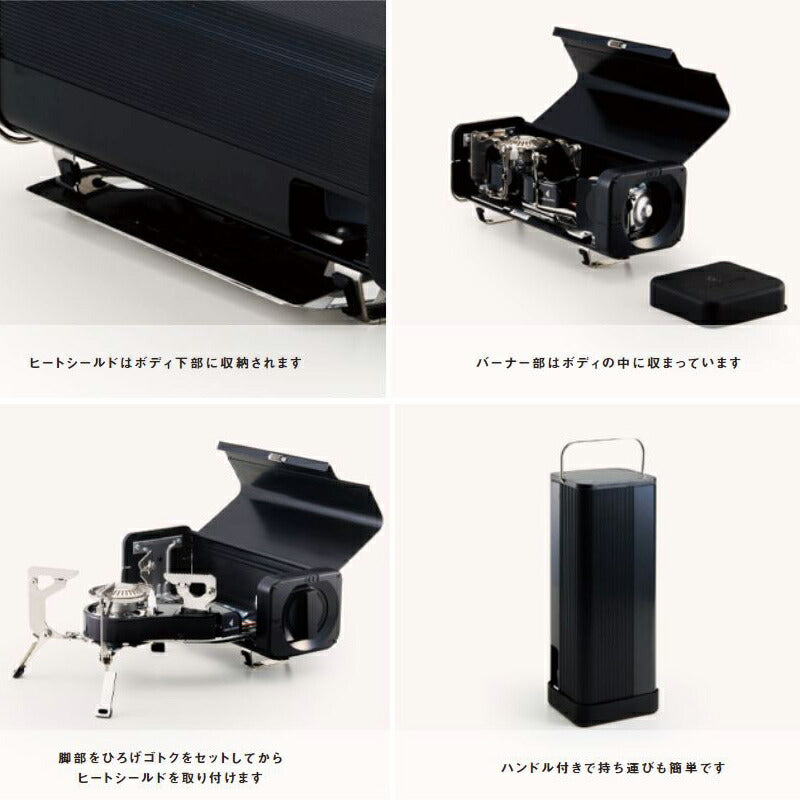 収納時はカセットコンロと分からないデザインですが、誰でも簡単に組立てられるように設計。美しく輝くステンレス製のヒートシールドは輻射熱によるテーブルへのダメージを抑えます。ハンドル付きで持ち運びも簡単です。